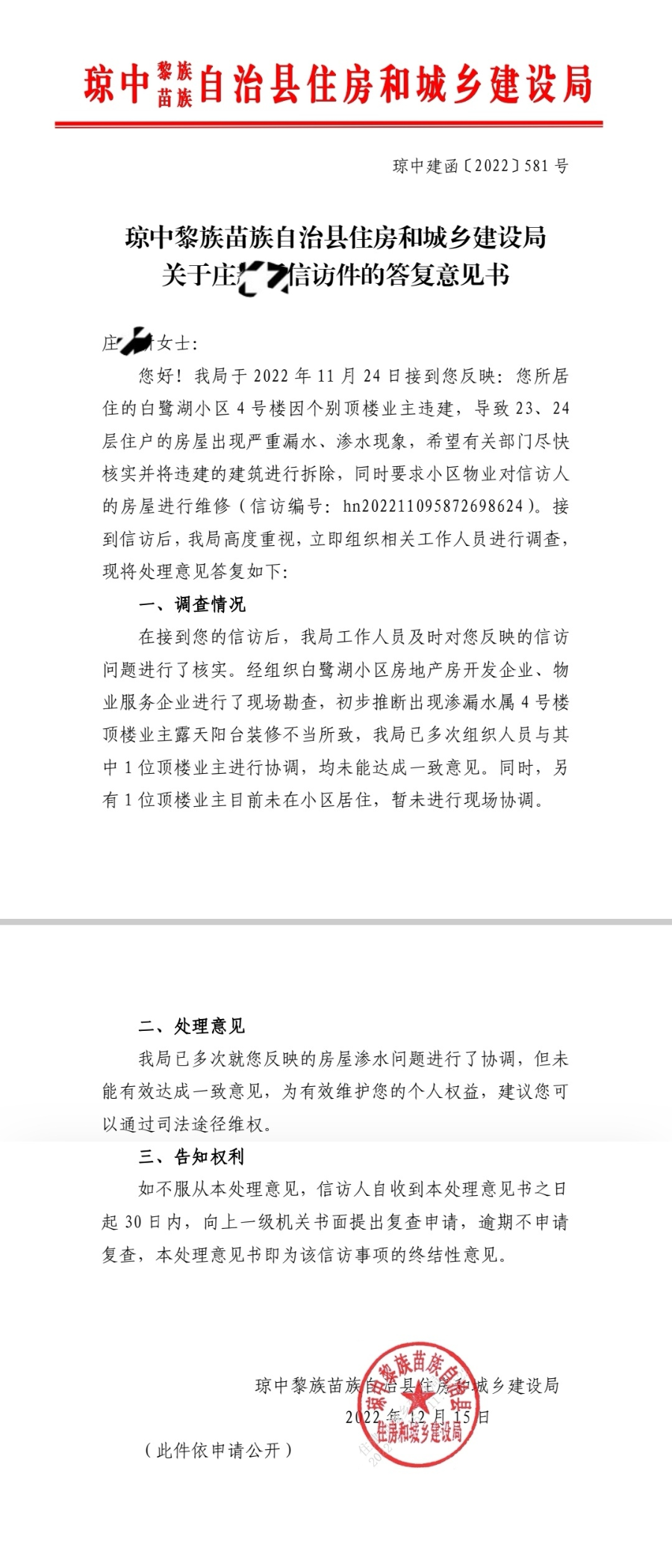 截至12月15日,因为每项法式均有必然的打点或公示时间,庄密斯能够通过司法路子。且涉及汗青缘由形成,惹起各方注沉。该局曾经多次就庄密斯反映的衡宇渗水问题进行了协调,有家住琼中湾岭镇金手指白鹭湖度假区的住户报料反映,琼中黎族苗族自治县住房和城乡扶植局对庄密斯件进行了回答,琼中住建局相关担任人暗示,另一顶楼业从目前不正在小区栖身,